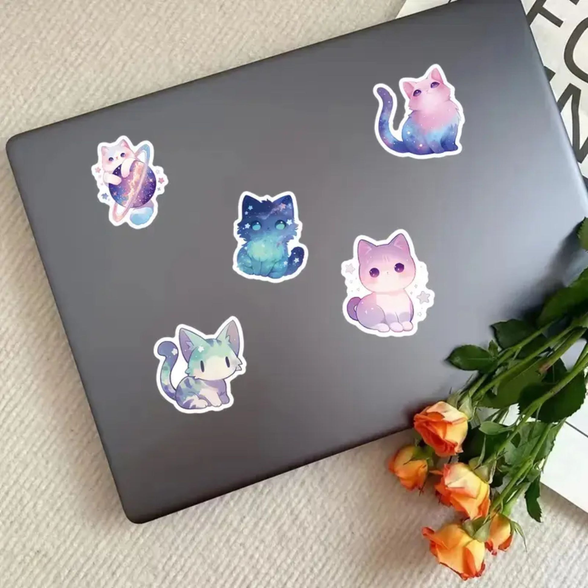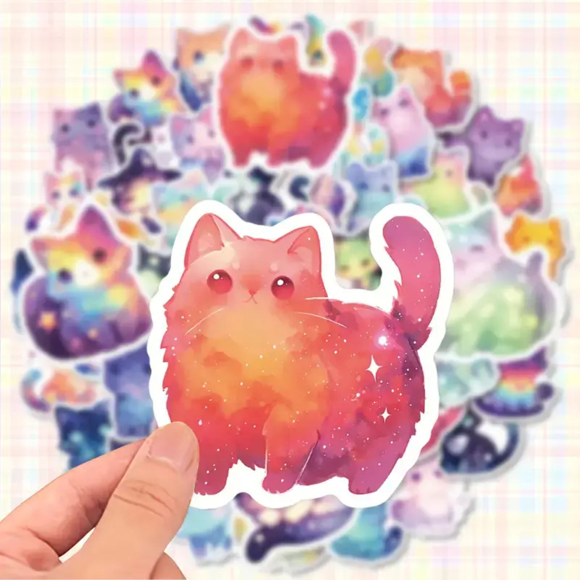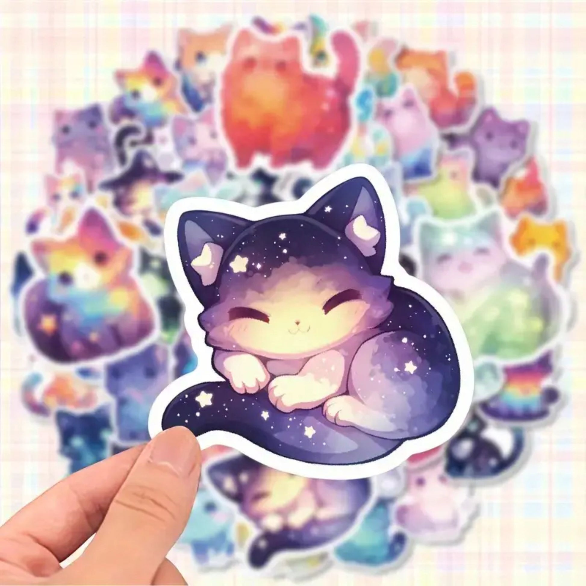 Net 50 spalvingų lipdukų su žaismingomis katėmis, pasipuošusiomis žvaigždėtu dangumi. Kiekvienas lipdukas – tarsi mažytė visata, kupina paslapties ir dangaus poezijos.