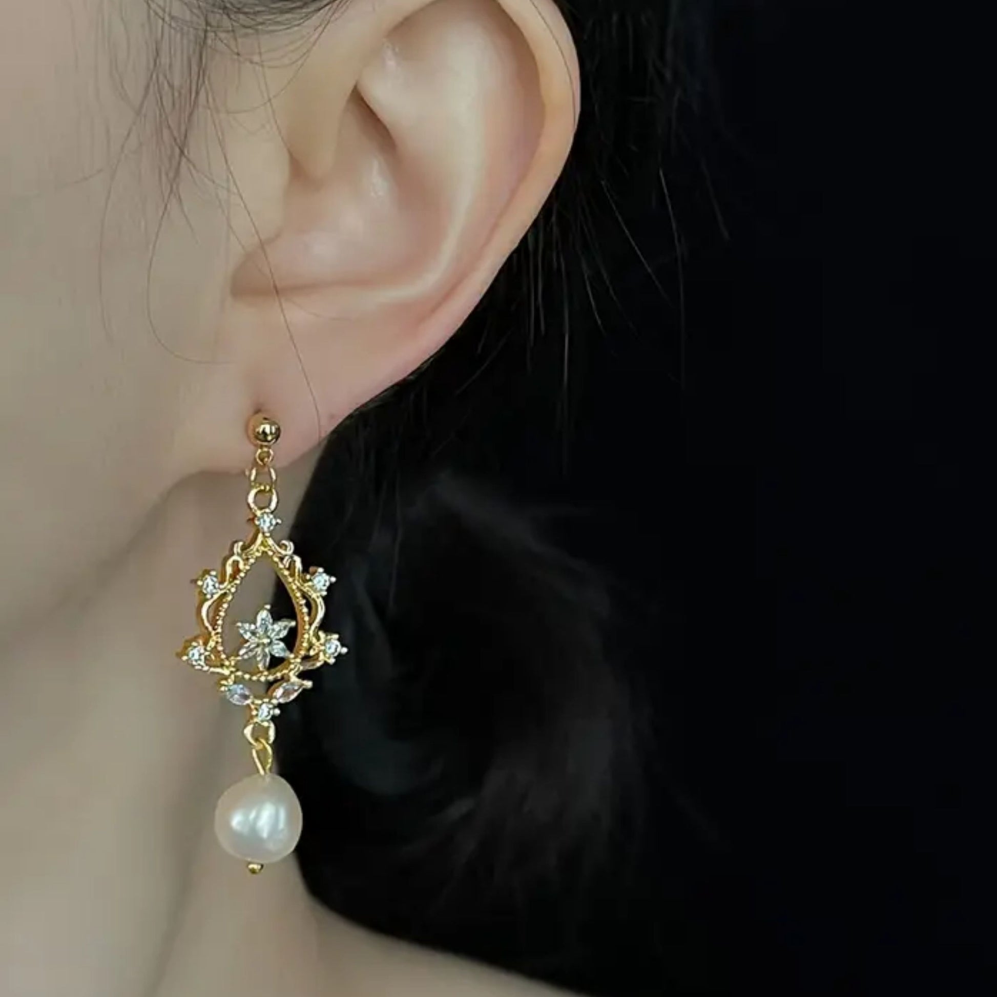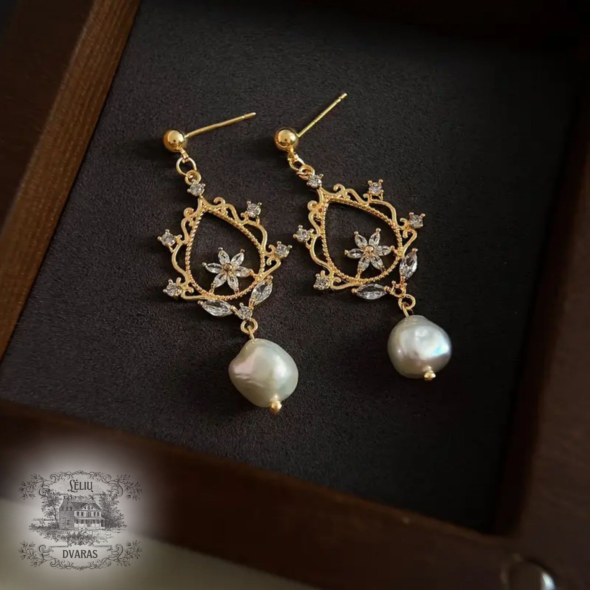Išraiškingi, vintažo įkvėpti auskarai, papuošti gėlės motyvu ir elegantišku lašo formos dizainu. Švelniai derinami akcentai suteikia jiems prabangos bei subtilaus žavesio – tai aksesuaras, tinkantis tiek kasdienai, tiek ypatingoms progoms.