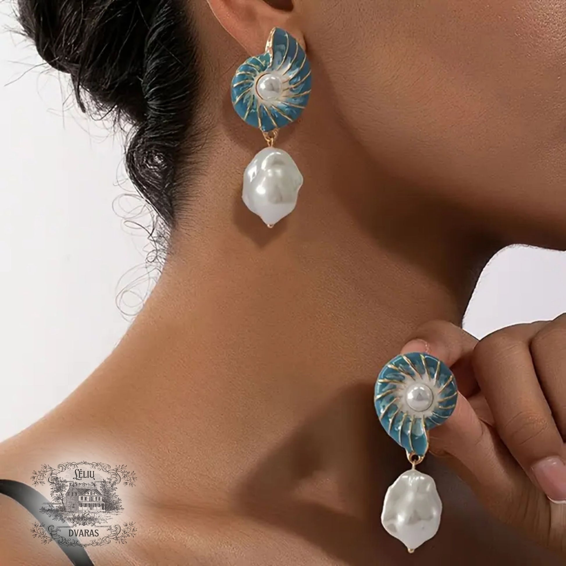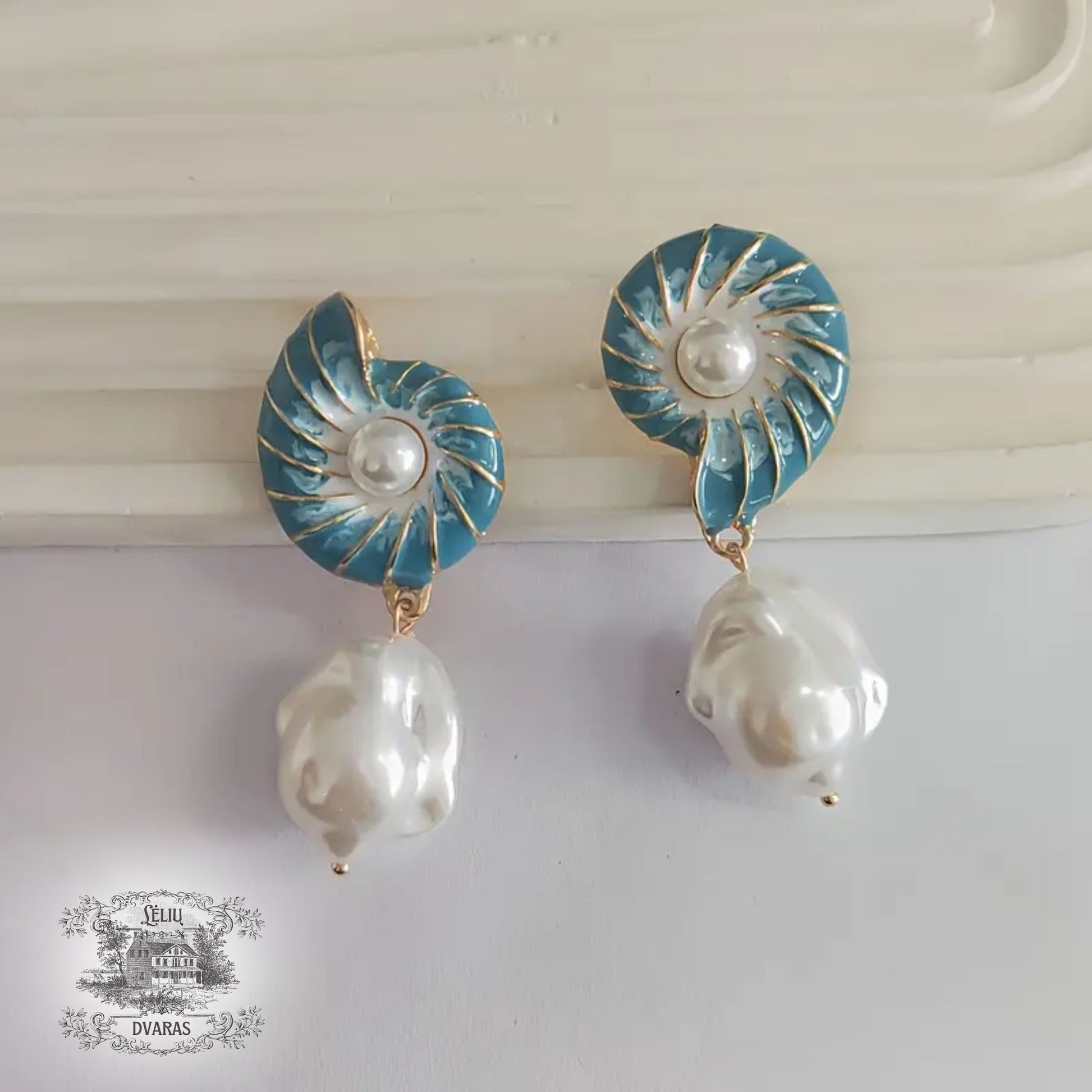 Šie auskarai pasakoja seną istoriją apie vandenyno gelmes. Mėlynoji kriauklė, papuošta perlo spindesiu, slepia savyje undinių paslaptis – sakoma, kad tokie perlai gimsta tada, kai jūros dukros dainuoja mėnulio šviesoje... 🌊✨