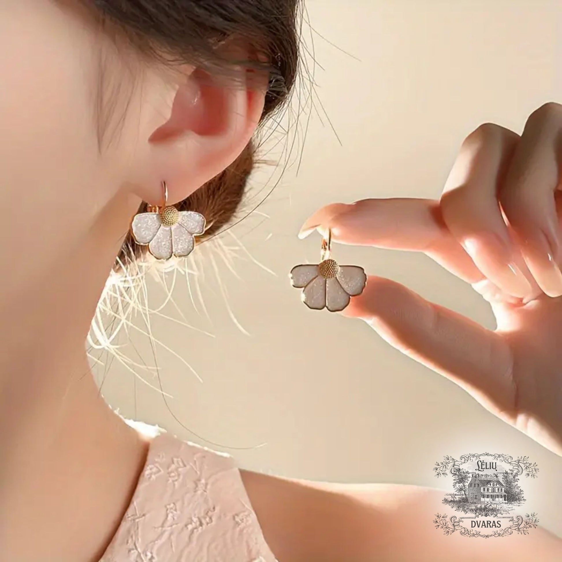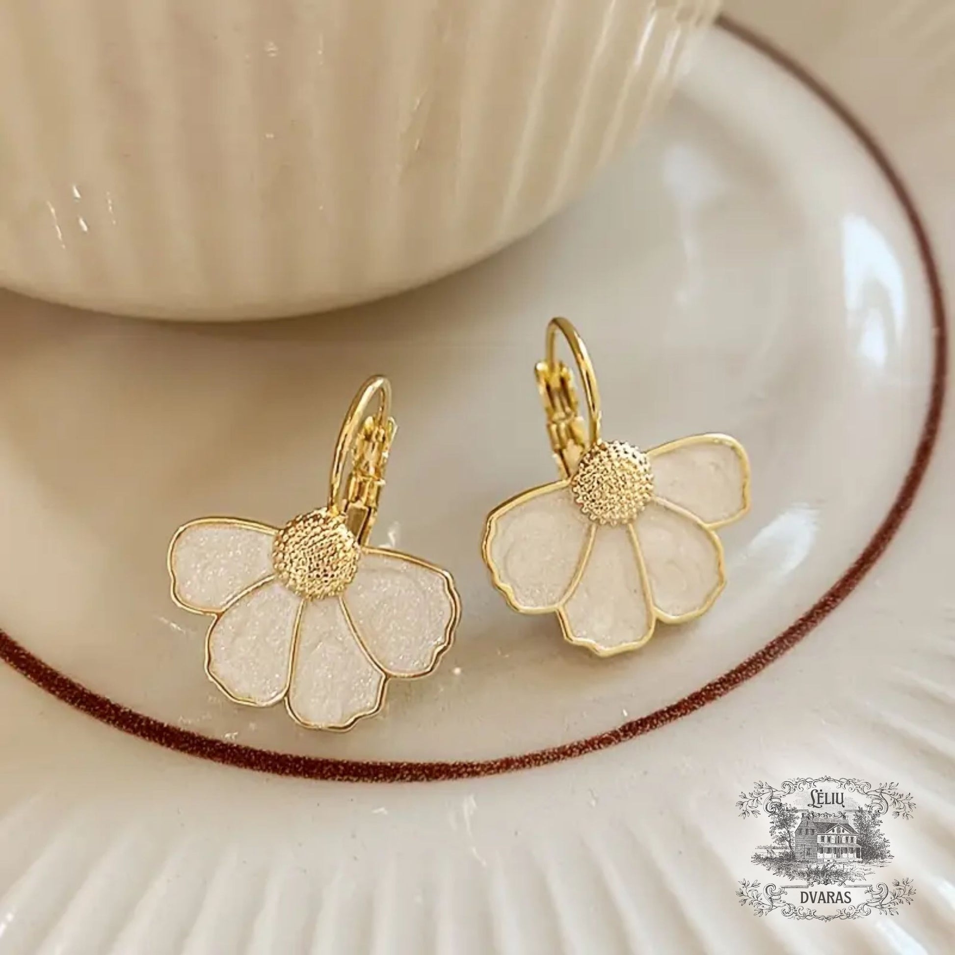 Lėlių dvaro papuošalų dėžutėje – balti auskarai, dvelkiantys prancūzišku žavesiu ir rafinuota elegancija. Kiekvienas keturlapis žiedelis čia byloja apie grožį bei darną.