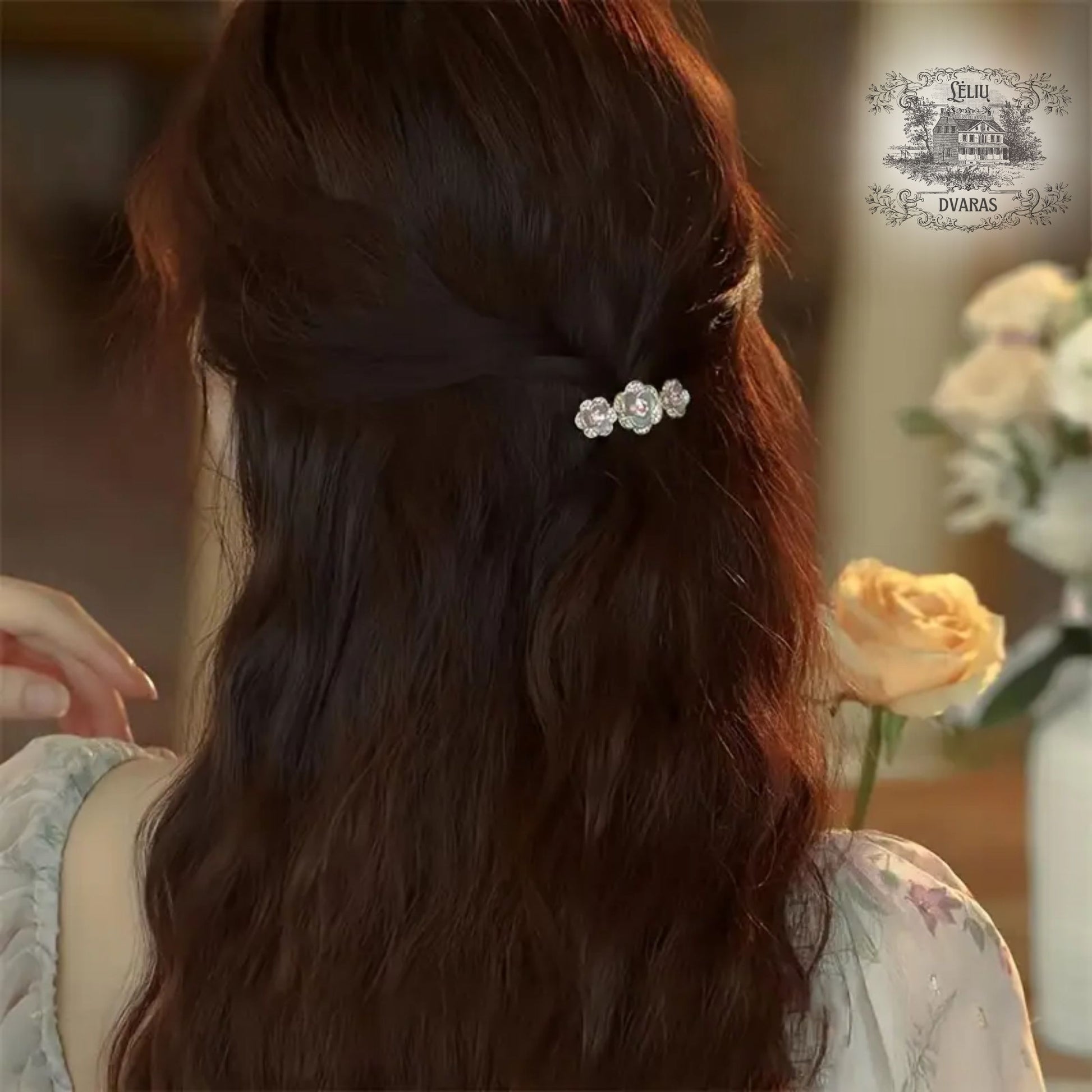 Smulkios, bet kruopščiai išgautos gėlytės primena rūmų sodus, kur švelniai kvepia rožės ir čiurlena fontanai. Segtukas suteikia plaukams dailų akcentą – jis puikiai tinka ir kasdienai, ir iškilmingai dienai.
