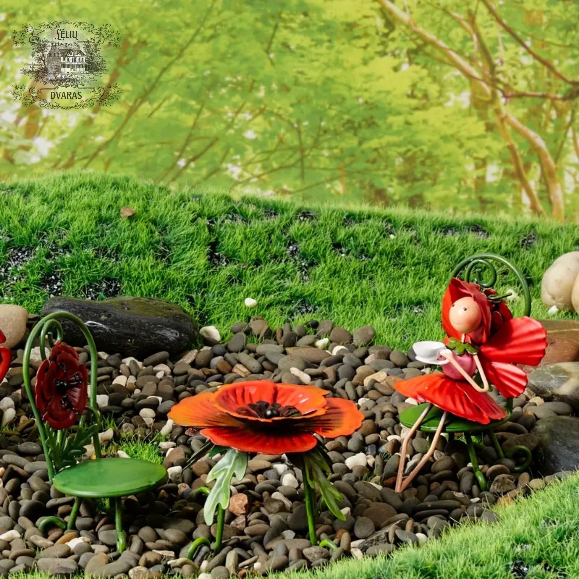 Ši rankų darbo metalinė statulėlė (11 cm) kartu su staliuku ir dviem kėdutėmis taps ypatinga jūsų sodo ar terasos puošmena.