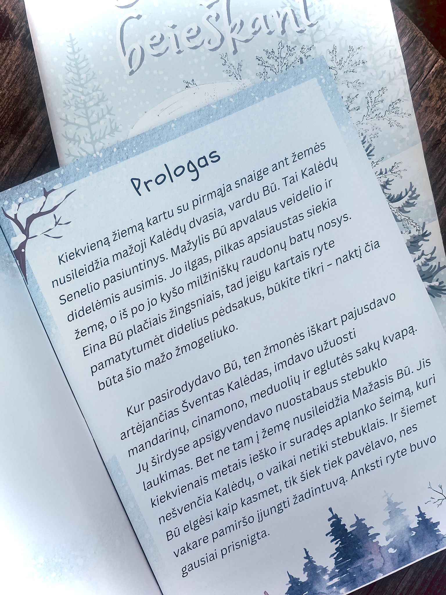 Kiekvieną žiemą kartu su pirmąja snaige ant žemės nusileidžia mažoji Kalėdų dvasia, vardu Bū. Tai Kalėdų Senelio pasiuntinys. Mažylis Bū apvalaus veidelio ir didelėmis ausimis. Jo ilgas, pilkas apsiaustas siekia žemę, o iš po jo kyšo milžiniškų raudonų batų nosys. Eina Bū plačiais žingsniais, tad jeigu kartais ryte pamatytumėt didelius pėdsakus, būkite tikri – naktį čia būta šio mažo žmogeliuko…