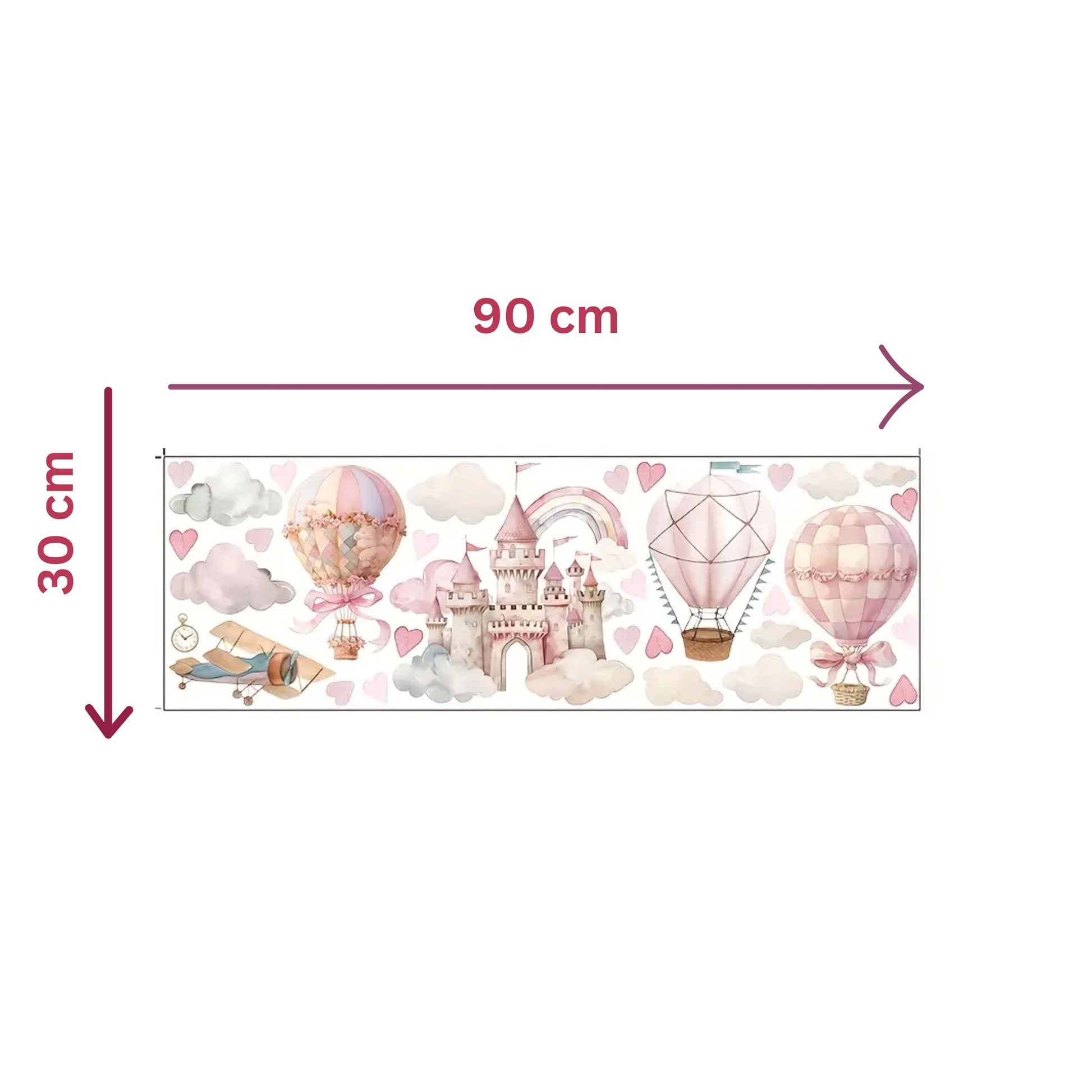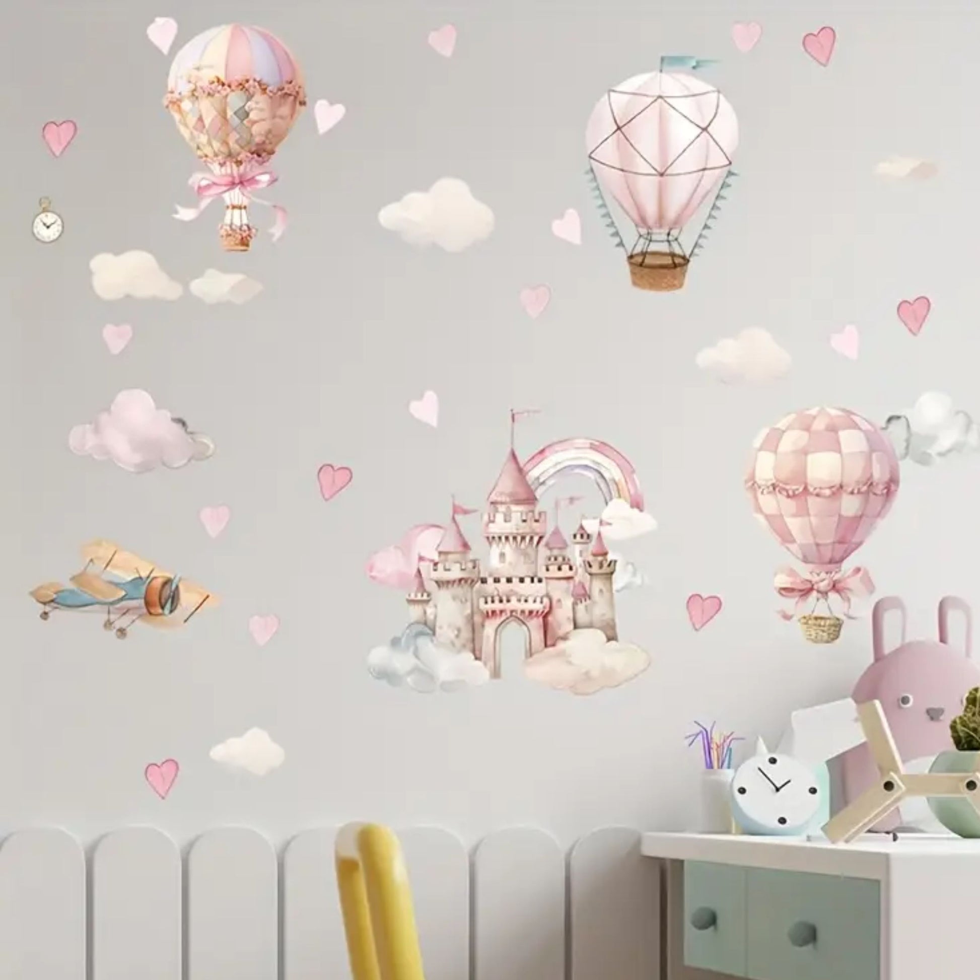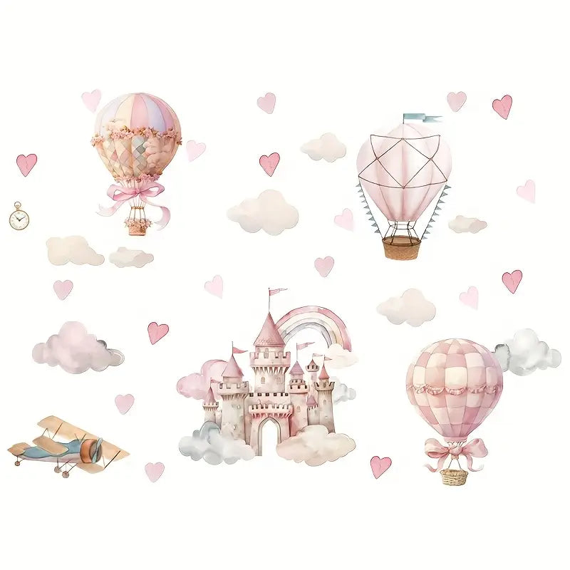 Rožiniai, pasakiški lipdukai su pilimi, oro balionais ir lėktuvėliu – puikiai tinka vaikų kambariui ar jaukiai erdvei papuošti. 🌸