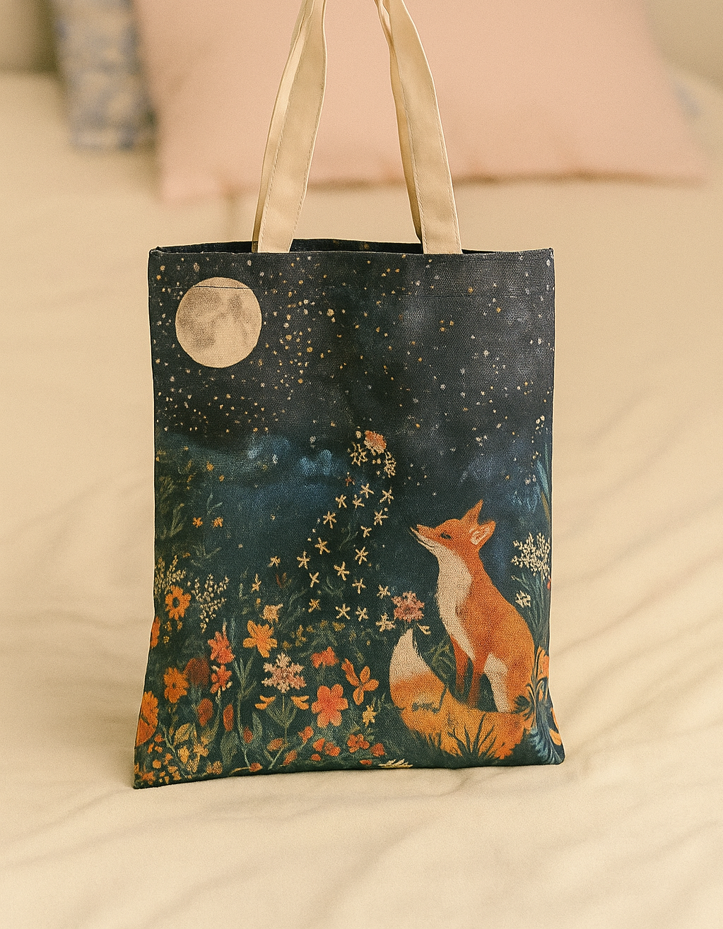 Jaukus drobinis maišelis su žavinga iliustracija – laputė Rudnė žvelgia į apvalų kaip sūris mėnulį žvaigždėtame danguje.