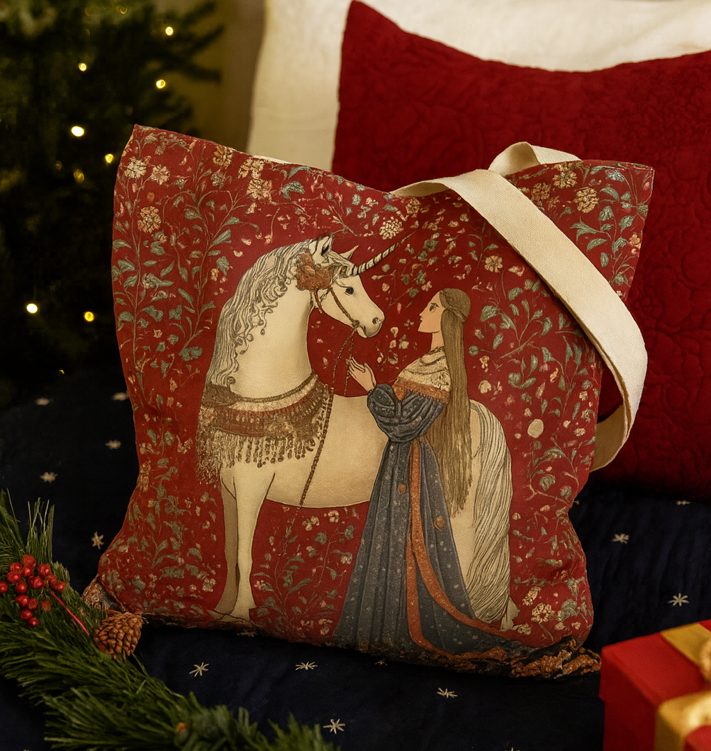 Į žavingą dvaro pasaką nukeliantis dvipusis medžiaginis maišelis, dekoruotas viduramžių stiliaus dama ir baltuoju vienaragiu, taps ne tik praktišku, bet ir išskirtiniu jūsų kasdienybės aksesuaru.