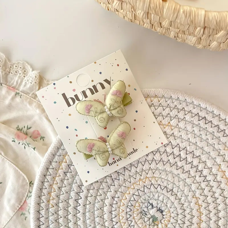 🦋 Žali drugeliai plaukuose Rankų darbo, siuvinėti segtukai – tarsi maži drugeliai, nutūpę ant plaukų.
