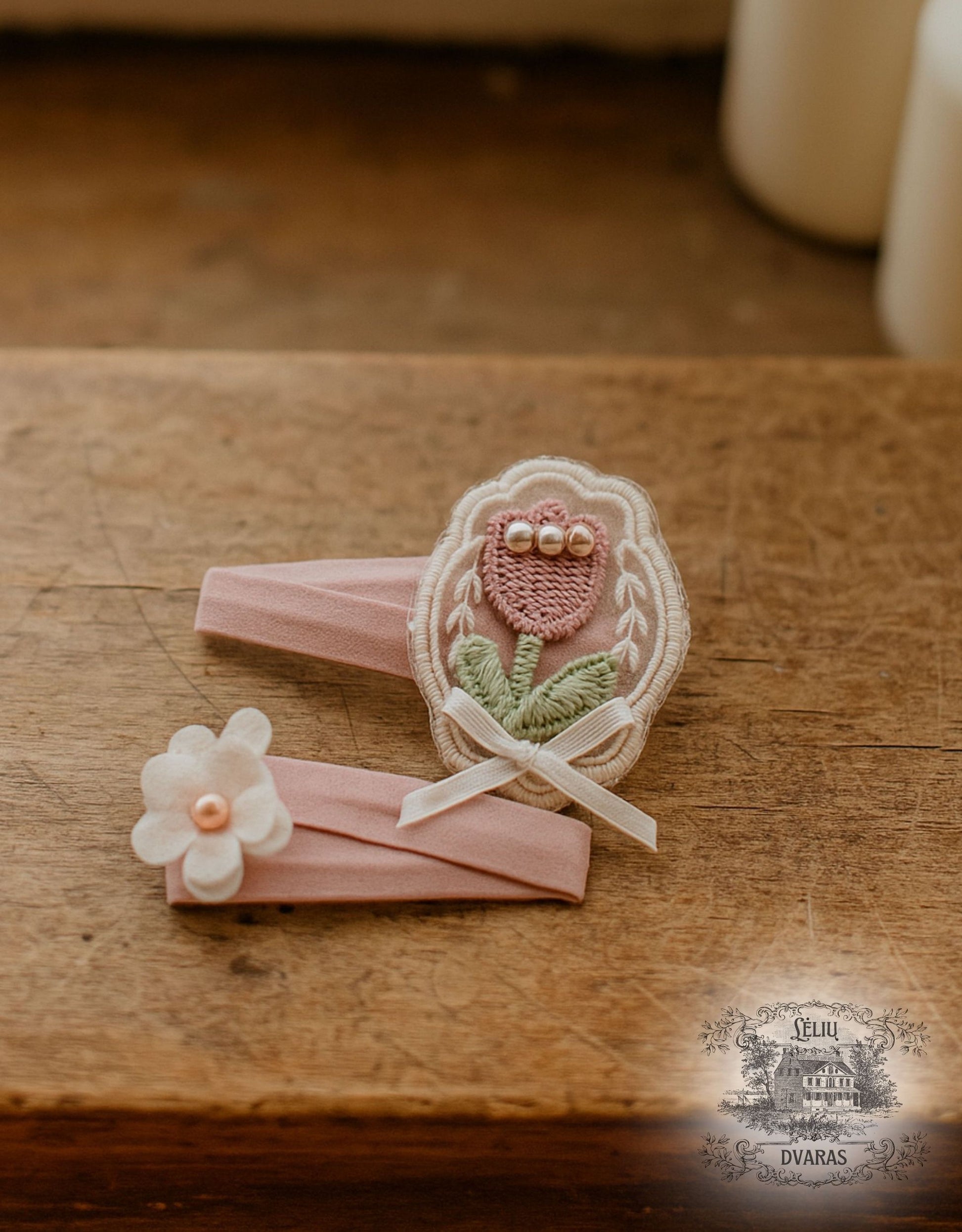 Šie mieli segtukai – tikra pasakos detalė kasdienai. Rožinės tulpės ir mažos gėlytės, siuvinėtos rankomis, o balti karoliukai suteikia švelnaus spindesio ir elegancijos.