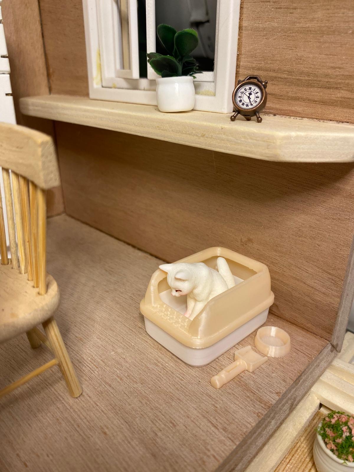 - Baltas katinukas su savo tualeto dėžute ir priedais.